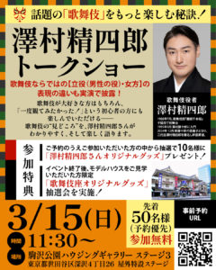 カテゴリー: 出演情報 作者: n投稿日: 2026年2月19日2026年2月19日 駒沢公園ハウジングギャラリーにて開催されるトークショーに、澤村精四郎が出演いたします。観覧無料・ご予約制(先着50名様)となっております。皆さまのお越しをぜひ、お待ちしております。◆日時:2026年3月15日(日) 11時30分~12時30分(開場 11:15予定)◆会場:駒沢公園ハウジングギャラリー(東京都世田谷区深沢4丁目26)◆観覧無料(予約制) ▼ ご予約方法・詳細はこちらをご覧ください。 【東京都世田谷区】3/15(日)開催!参加無料★「澤村精四郎トークショー」事前申込のご案内 \話題の「歌舞伎」をもっと楽む秘訣!/🎭 澤村精四郎トークショー 歌舞伎が大好きな方はもちろん、「一度観てみたかった!」… https://sawamura0315.peatix.com/ 3月15日・トークショーに出演